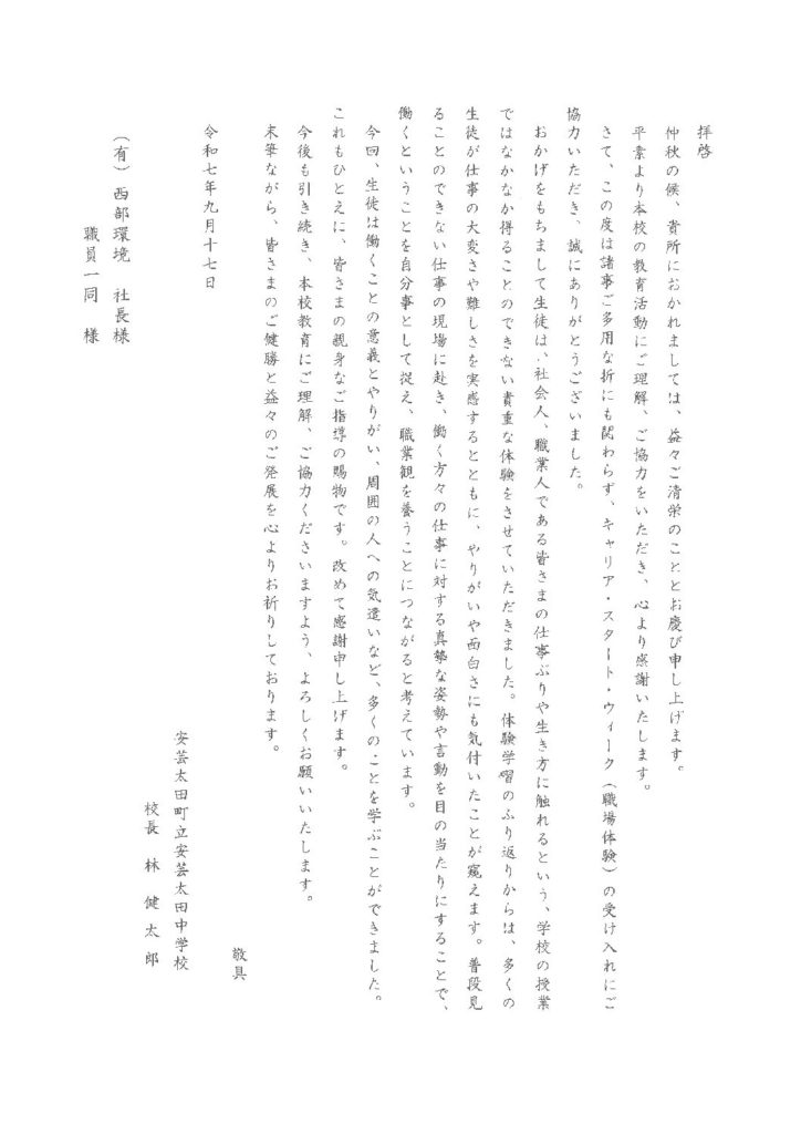 その他 職場体験 2025.09.20 2025.10.25 この記事のタイトルとURLをコピーする 先日(10日~12日)の職場体験終了後、安芸太田中学校様からお礼のお手紙をいただきました!!こういった形で、協力できたことは私たちとしましても、喜ばしいことです。今後もいろいろなことにチャレンジしていきますので、よろしくお願いします!! Post Share Hatena Pocket RSS feedly Pin it